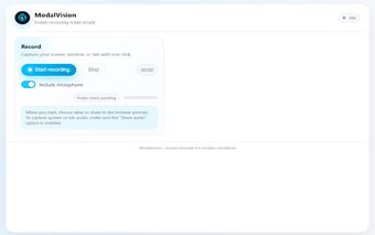 ModalVision Screen Recorder to darmowe rozszerzenie do przeglądarki Chrome, które umożliwia łatwe nagrywanie ekranu, okna lub karty z dźwiękiem. Dzięki eleganckiemu i nowoczesnemu interfejsowi użytkownicy mogą szybko nagrać swój ekran, podglądać wynik, przycinać niepotrzebne fragmenty i pobierać nagrania w wysokiej jakości. Kluczowe funkcje obejmują jednoczesne nagrywanie dźwięku z mikrofonu oraz wskaźnik poziomu dźwięku, co zapewnia doskonałą jakość audio w każdym nagraniu.